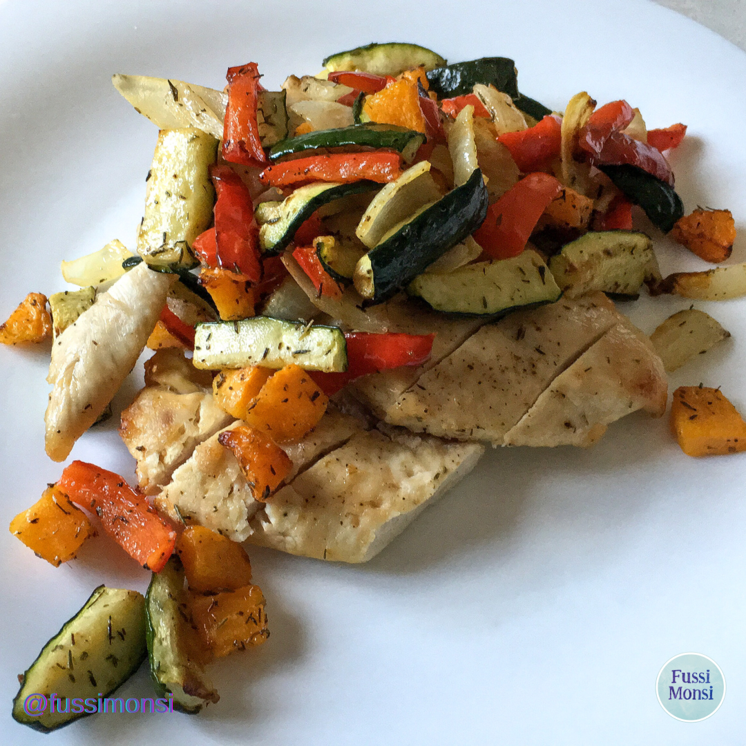 5️⃣ Colocamos la pechuga de pollo sobre las verduras asadas y servimos.